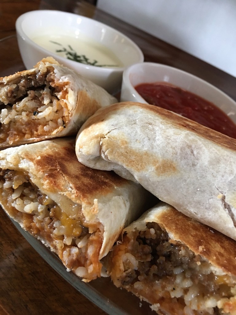 Spread refried beans onto one side of the tortilla > add just enough amount of spiced rice > throw in some ground beef > go crazy with the cheese > add in jalapeños for some heat (optional) > wrap your burrito making sure the sides are folded then roll up!