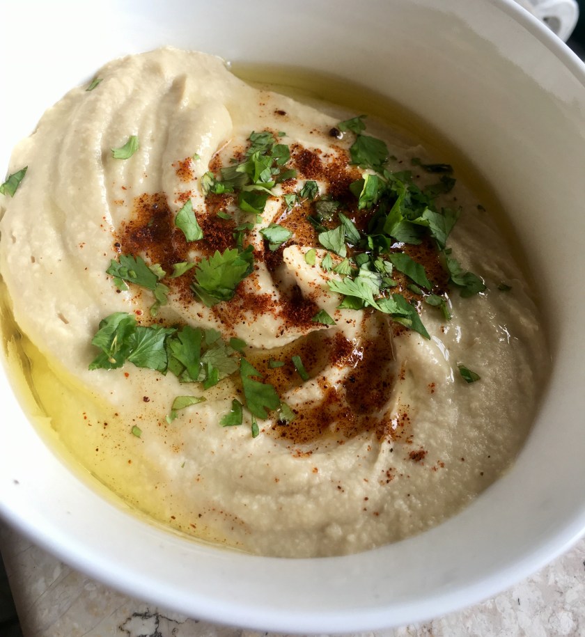 5. Prepare your Pita Pockets (quickly warm them in a pan). Place just the right amount of Hummus dip in a bowl, drizzle with a little bit of cumin (optional) and paprika then sprinkle with finely chopped parsley. Voi-la!