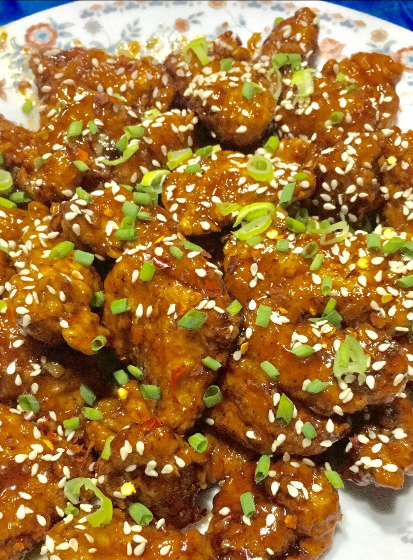 • SAUCE time! get a new clean pan. Add your prepared sauce, let it simmer and reduce for about 3 minutes. Once it bubbles and consistency becomes thick, add in all your crispy chicken and coat them all with your flavorful sauce