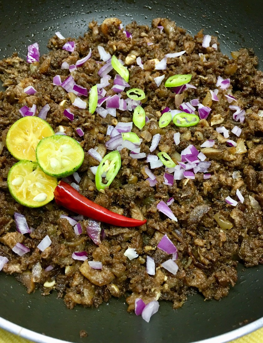 5. Add in the liver spread and soy sauce/liquid seasoning . Throw in the minced red onions and give it a good mix. Cook it for another 5 minutes or so.