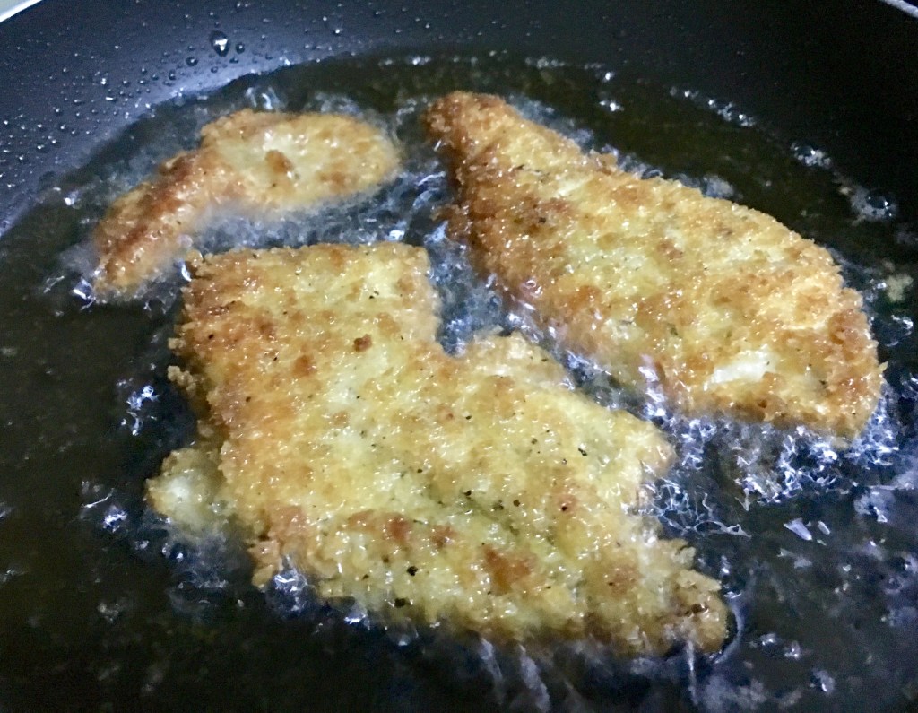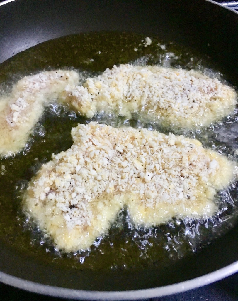2. Get 3 separate bowls for the flour, beaten eggs and panko. First, coat entire chicken breast in flour. Next, dip chicken in beaten egg making sure all parts are covered (I usually use tongs to do this so it won’t stick to my hands). Lastly, press into the panko crumbs until well coated.